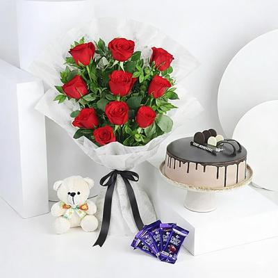 A beautiful arrangement of premium, unscented red roses, accompanied by a plush peach-coloured teddy bear and a delectable chocolate cream cake. All carefully arranged abd the bouquet is tied with a black satin ribbon that adds a final touch of sophistication to this exquisite gift.