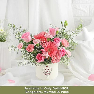 Charming and full of character this arrangement of light pink roses cheerful gerberas and dainty spray carnations is beautifully accented with bottle grass and presented in a rustic terracotta pot. Its soft earthy tones and natural textures make it a heartfelt gift for any occasion whether youre celebrating love friendship or simply brightening someones day. The terracotta base adds a warm grounding touch creating a floral piece that feels both cosy and elegant. A thoughtful gesture that brings beauty serenity and a hint of countryside charm into any space.