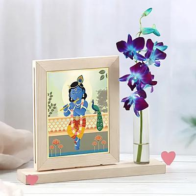 Celebrate the divine charm of Lord Krishna with this exquisite Rotating Photo Frame with Test Tube. Crafted from premium wooden MDF it features two beautifully designed frames adorned with delicate pink roses showcasing Lord Krishna alongside a graceful peacock. A perfect addition to any home or office this elegant frame not only holds your cherished memories but also rotates to display them from different angles adding a touch of festive spirit. Ideal for gifting this Janmashtami it brings warmth elegance and a divine aura to any space.