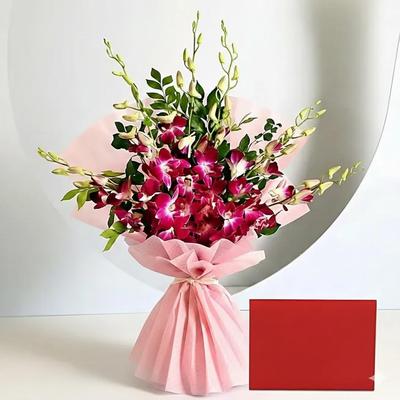 A stunning bunch of orchids to wow the special someone. Beautifully wrapped in delicate non-woven paper and tied with ribbon, this designer bouquet is sure to bring a smile on your loved ones face.