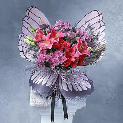 Just as the name suggests, a Butterfly Garden is a floral arrangement in the shape of a butterfly. The intricate details and vibrant colour shades are bound to leave your loved one with a wide smile on their face. It comprises purple roses, daisies and beautiful fragrant oriental lilies, making a mesmerising bouquet for family and partner alike. The black mesh paper brings out the bold colours ever so dramatically in front.
