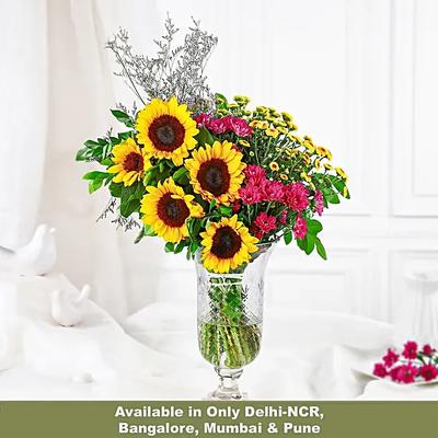 This Valentine's Day flowers bring a dash of sunny happiness and positivity to your partner's life with our vibrant Sunflower Splendor. With sunflowers backed by the essence of purple daisies and delicate yellow buttons, this bouquet is a one-of-a-kind present for anyone. Go with the hand-tied arrangement, or pick a chic glass vase for a lovely centrepiece for your living room table.