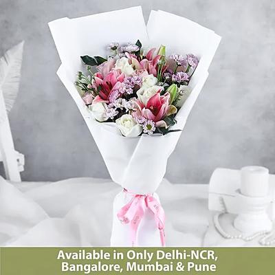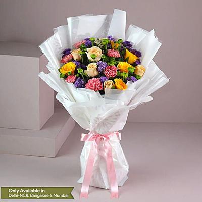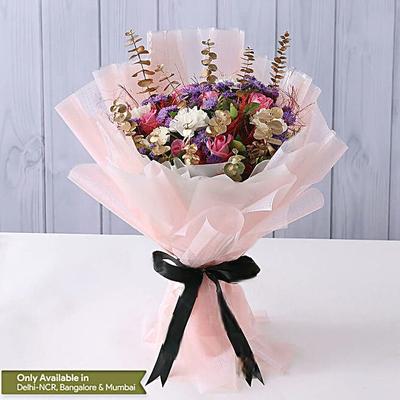 What could be more charming than a beautiful arrangement of soft pink roses and vibrant purple daisies tied together in a gorgeous floral bouquet? Adorned with a renowned Blissmygift ribbon, this arrangement is ideal for a birthday celebration or a romantic night. If picking for your girlfriend, add a chic floral-shaped personalised necklace for a heartfelt romantic present.