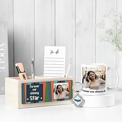 Light up their world with an ambient personalized lamp, paired with a matching keychain or rotating photo cube for a truly dynamic and sentimental gift.