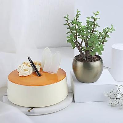 Immerse your loved one in the refreshing Jade plant, known for its vibrant green leaves and symbolic of luck and prosperity. It comes in a golden tropical pot, adding a touch of elegance to any space. Accompanying the plant is a luscious butterscotch cake, adding sweetness to the occasion. Perfect for bringing a tropical touch to their surroundings and indulging in a delightful treat, this gift combo is a wonderful way to show your affection and brighten their day.